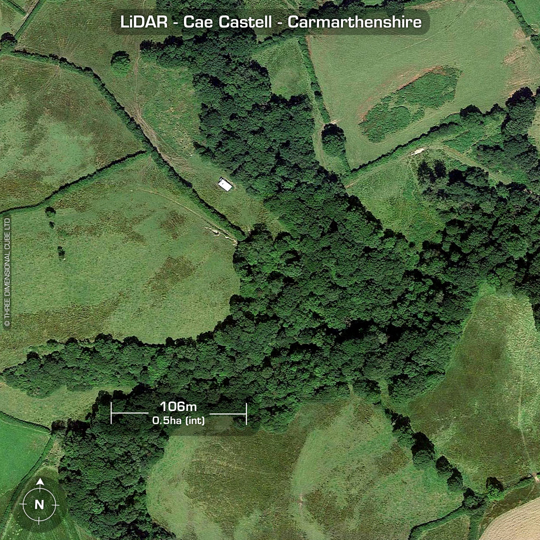 LiDAR – Cae Castell - Carmarthenshire DTM- (Digital Terrain Model, i.e. No buildings or foliage) Overlooking the (river) Afon Myddyfi and 1.3km northwest of the A40 at Pentrefelin sits the heavily degraded inland promontory fort, Cae Castell. Ramparts only visible at low lighting angles or on LiDAR. Boundaries obscured by woodland. Not on old OS Maps. First recorded in 1917 via its (field) name which was suggestive but a site visit could not find any explanation of its Castell moniker until in 2008 when the earthworks were discovered & recorded. A past farm owner found a Bronze Age socketed axe inside the promontory while ploughing. No recorded excavations hence, undated*. (Scheduled monument) Iron Age tribal association (conjecture based on location): Demetae *Possible age range 2000-2700BP (Before present) Descriptions from hillforts.arch.ox.ac.uk & Dyfed Archaeological Trust HER. 1st ED OS Mapping via National Library of Scotland. Contains public sector information licensed under the Open Government Licence v3.0.